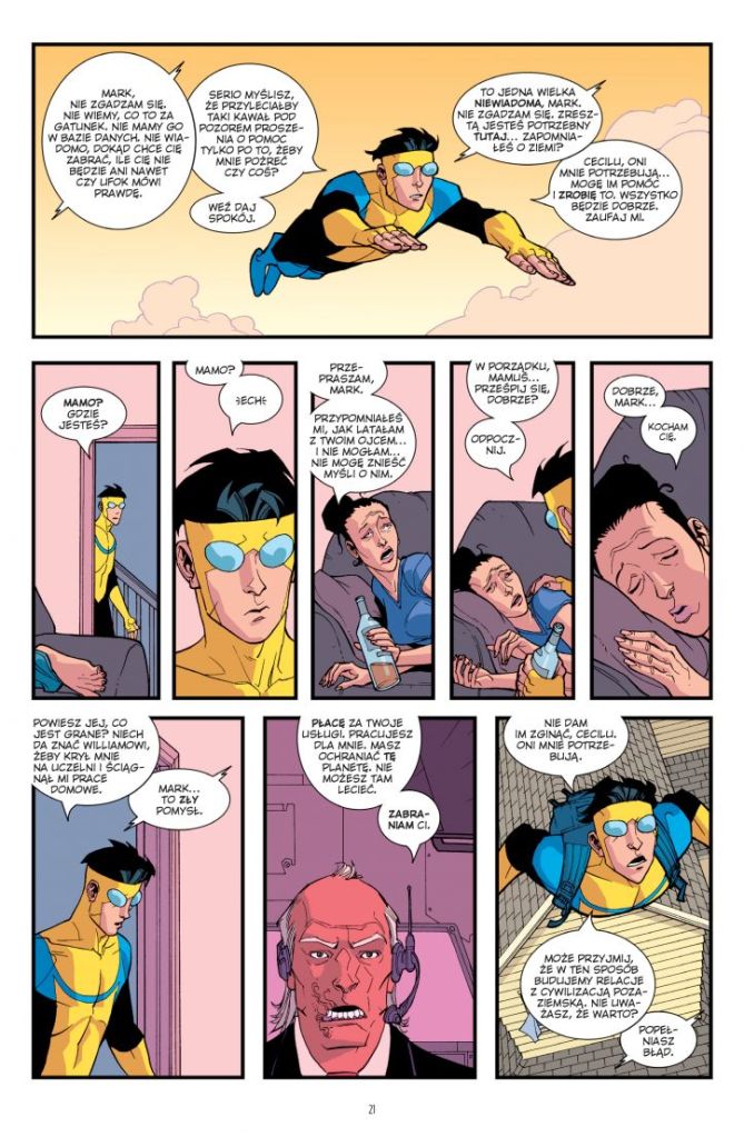 I dostaję w następnych rozdziałach. Choć Mark nienawidzi ojca za to co zrobił, ten jest jednak jego tatą, a tatę ma się tylko jednego i te uczucia w większości przypadków nie giną. Twórcy komiksu nie oszczędzają jednak swoich postaci i od razu zrzucają na nich zagrożenie w postaci podbijających planety mieszkańców Viltrum. Od samego początku trwamy w napięciu, czekając co wydarzy się dalej. Akcji jest mnóstwo i ani na chwilę nie przestajemy zastanawiać się nad tym czym jeszcze zaskoczą nas Kirkman, Ottley i Crabtree.