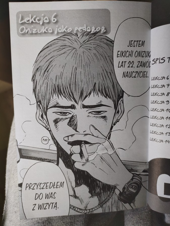 Najnowszy tom „GTO” przynosi nam początek bardzo ciekawie i zabawnie zapowiadającego się konfliktu głównego bohatera z przewodniczącym grona nauczycielskiego zboczonym panem Uchiyamadą. W końcu manga zdaje się wchodzić na pewien określony tor, gdyż Onizuka znajduje pracę i wszystko wskazuje na to, że szybko jej nie zmieni, choć warunki ma co najmniej skomplikowane. Zobaczymy jak poradzi sobie z przeróżnymi grupkami uczniów.