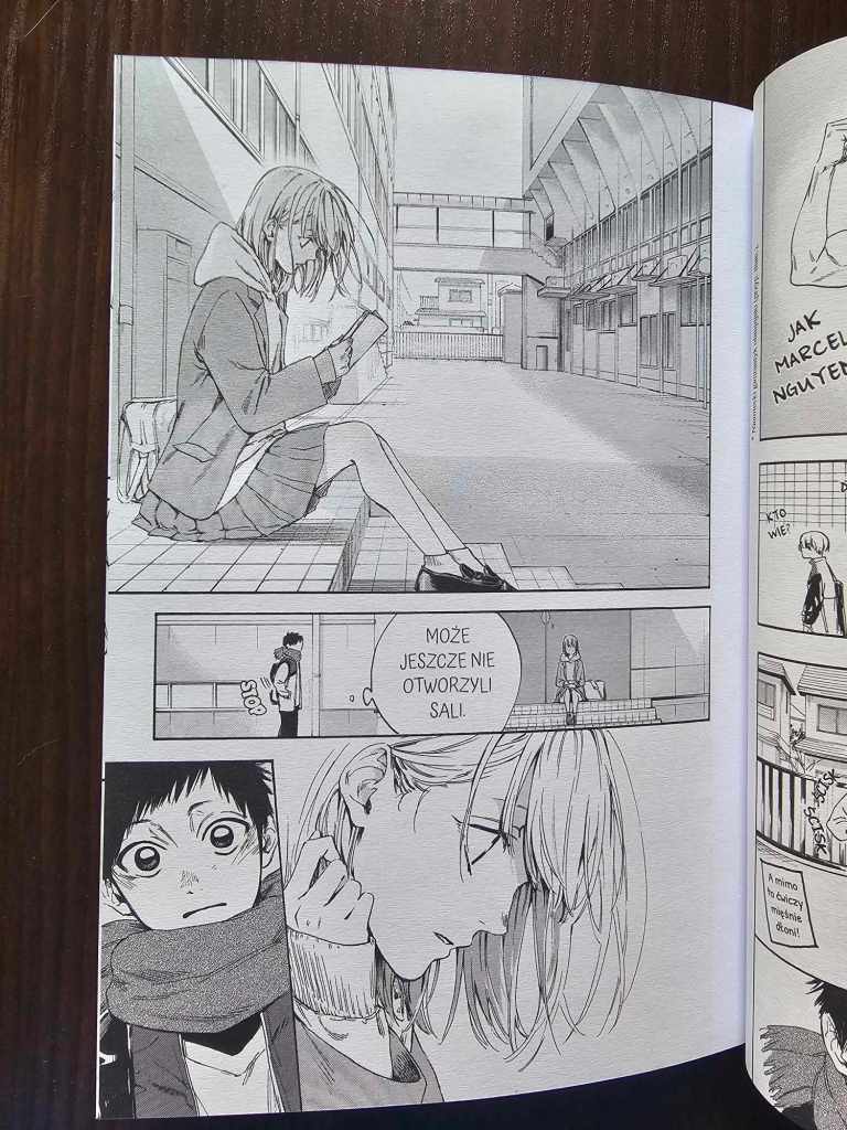 Niebieskie pudełko prezentuje się bardzo solidnie jeśli chodzi o ilustracje. Nie jest to może najbardziej oryginalna kreska, za to naprawdę dopracowana. Odpowiednio się zmienia, w zależności od nastroju historii. W bardziej komediowych scenach, pani Miura pozwala sobie na pewne niedociągnięcia, czy może raczej uproszczeń, które czytelnik doskonale zrozumie. No i zapomniałem powiedzieć nieco więcej o jednej kwestii. W tle mamy tutaj sport. Koszykówkę i badminton. Choć póki co są one właśnie bardziej tłem dla miłosnej historii, to elementy sportowe prezentują się dynamicznie i chciałbym zobaczyć ich więcej.