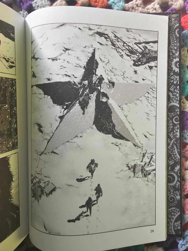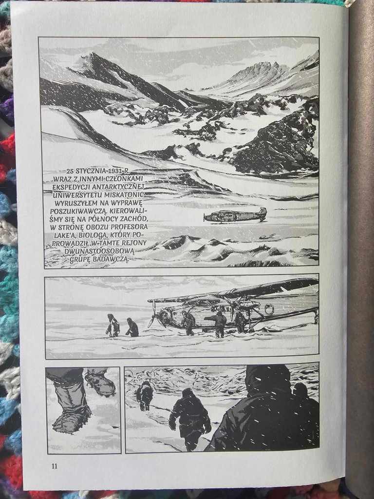 Jest kilka elementów, które bardzo zaimponowały mi w tej historii. Pierwszym z nich jest narracja i sposób budowania napięcia przez autora mangi. W górach szaleństwa zahipnotyzuje was odległymi, bezkresnymi, zimowymi krajobrazami. Akcja toczy się w spokojnym tempie. To wzmaga pewną atmosferę tajemnicy i niepewności. Niby mamy do czynienia z podróżą badawczą, więc cóż niezwykłego mogłoby się tu wydarzyć, prawda? A jednak, nawet pomijając wstęp, który daje nam pewne wyobrażenie tego co nas czeka na Antarktydzie, czujemy skrywające się w tej zimowej scenerii zło.