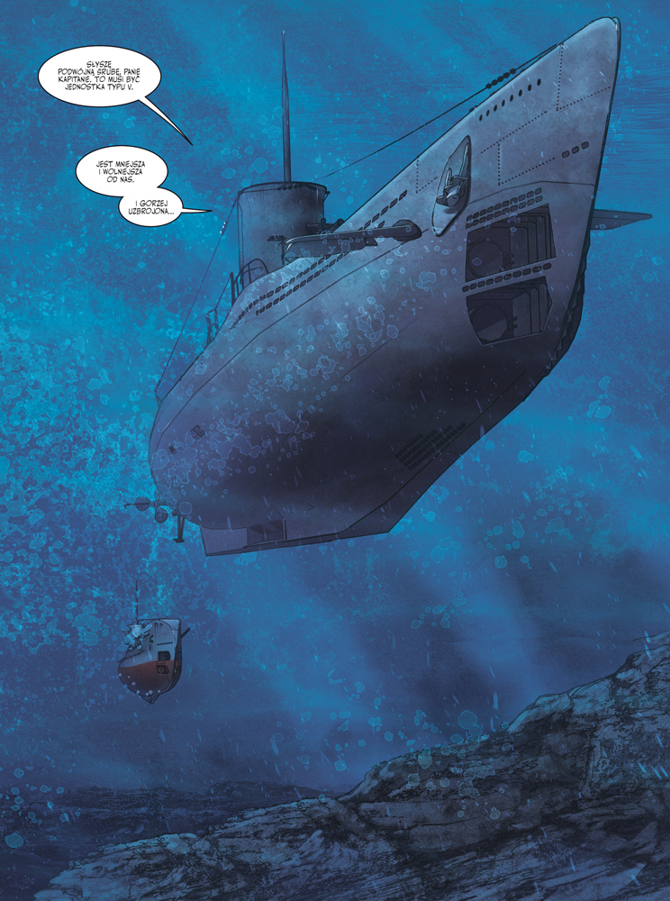 Co do strony wizualnej komiksu, to jedyne zarzuty mam do samych postaci. Wydają się one być zbyt idealny, wygładzone. Po prostu nie dostrzegam u nich tych trudów wojny, tym bardziej, że jest to już niemal jej konie. Sam krajobraz zniszczeń, czy morskie pościgi robią świetne wrażenie i pozwalają poczuć ten dreszczyk emocji i stres towarzyszący poszczególnym żołnierzom. Tylko ich wygląd mi tutaj nie pasuje.