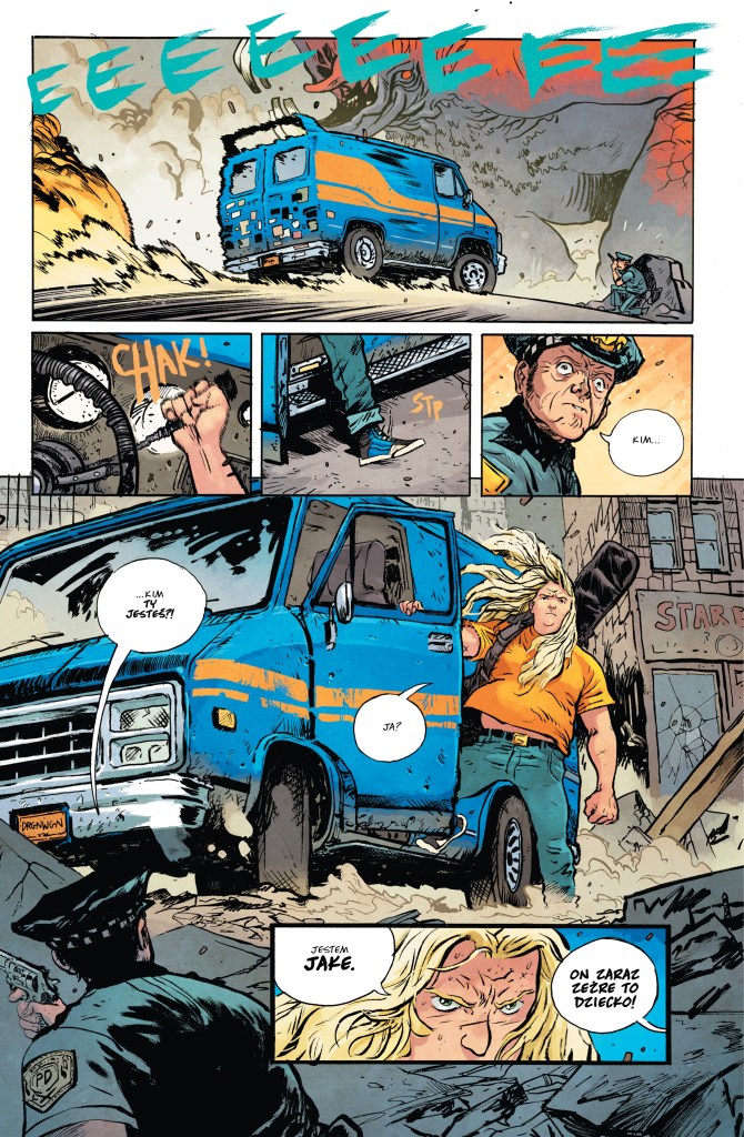 Komiks wciąga już od pierwszych stron. Zupełnie nie spodziewamy się bowiem nagłego pojawienia się wielkiego, napakowanego sokoła z cybernetyczną ręką, który zyskuje siłę dzięki łojeniu na gitarze jak to bardzo często określa sam komiks. Szybko zdajemy sobie sprawę, że będzie to historia oryginalna i naładowana akcją. Nie oznacza to jednak, że brakuje tutaj głębi. Im dłużej znamy Jake’a tym lepiej poznajemy jego przeszłość. Autor bardzo sprytnie napisał jego wątek i najbardziej uważni czytelnicy będą zaskoczeni, gdy wszystkie karty go dotyczące zostaną odkryte.