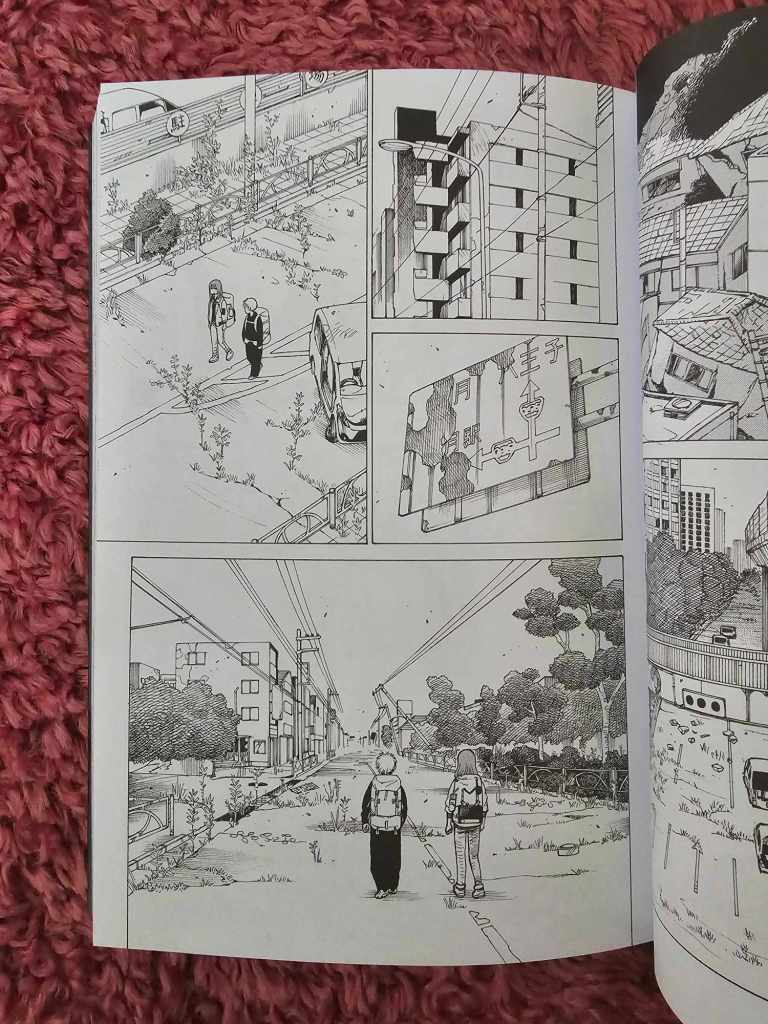 Lwia część tego pierwszego tomu skupia się na dwójce wspomnianych przeze mnie we wstępie bohaterów. Są nimi Maru i Kiruko. Maru to chłopak, który poszukuje „nieba”. Ma tam dotrzeć by przekazać komuś fiolkę z tajemniczą substancją. Towarzyszy mu dziewczyna-ochroniarz Kiruko. Razem przemierzają zgliszcza Japonii, która jak dowiadujemy się w trakcie ich podróży, przeszła jakąś katastrofę 15 lat wcześniej. Nie jest już bezpiecznym miejscem, wszędzie czają się potworne ludojady jak to określają nastolatkowie, ale każdy nieznajomy może okazać się zagrożeniem.