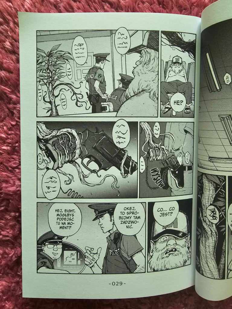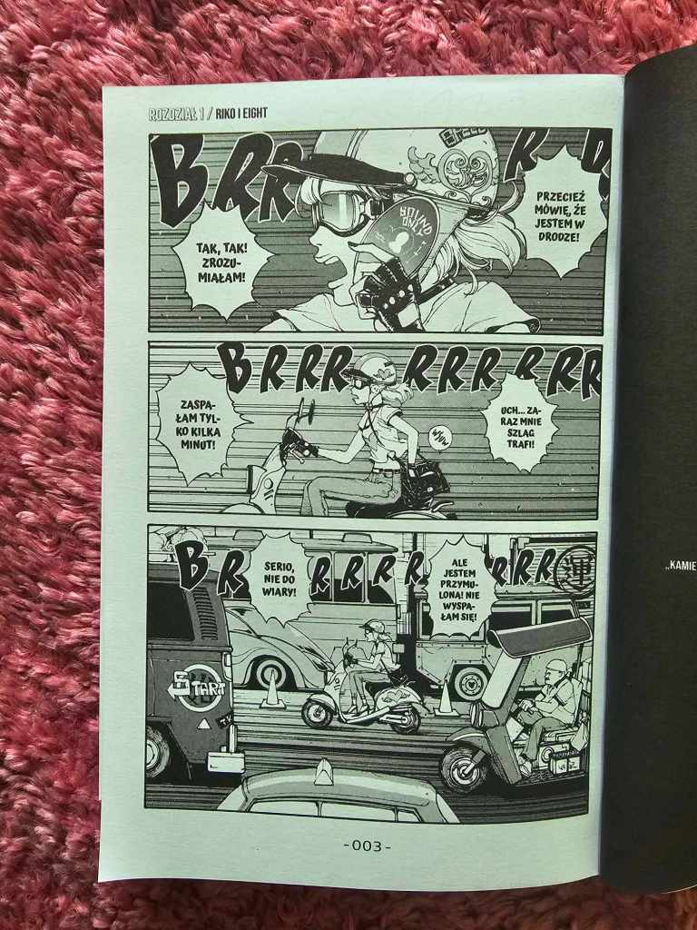Dwójka bohaterów zostaje wrzucona w wir akcji. Ta jest tutaj dynamiczna i tak właśnie powinno być, gdyż Eight jest ścigany. Powinien zatem być w tej historii suspens, zwroty akcji oraz odpowiednio wysoka dawka energii. Tak też jest, a autor dodaje jeszcze od siebie spory rozmach, gdyż przemierzając ulice nocnego miasta nie brakuje zniszczeń na wielką skalę. Wizualnie to wszystko przywiodło mi na myśl Akirę, Battle Angel Alitę czy Triguna choć Adou ukazuje się w Japonii od 2019 r.