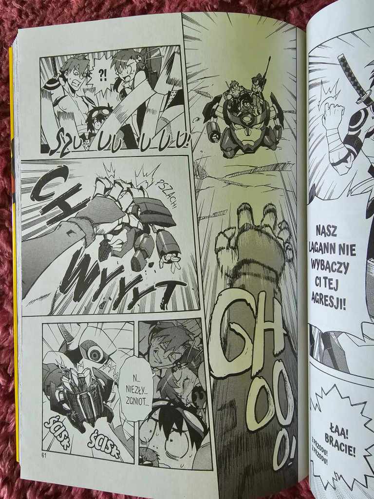Wielkie roboty, ale nie takie w stylu Gundam Wing, Evangeliona czy nawet Teknomana. To właśnie one sprawiły, że Przebijający niebiosa Gurren Lagann zapadł mi w pamięć, ale nie tylko. Choć kwestia walki z przeciwnikiem o wyzwolenie ludzkości wydaje się być bardzo poważna, to jest w tu pewien niezaprzeczalny element humoru, który wprowadzają nasi bohaterowie. Połączenie tych dwóch elementów wypada w mandze świetnie. Właśnie dlatego warto sięgnąć po ten tytuł.