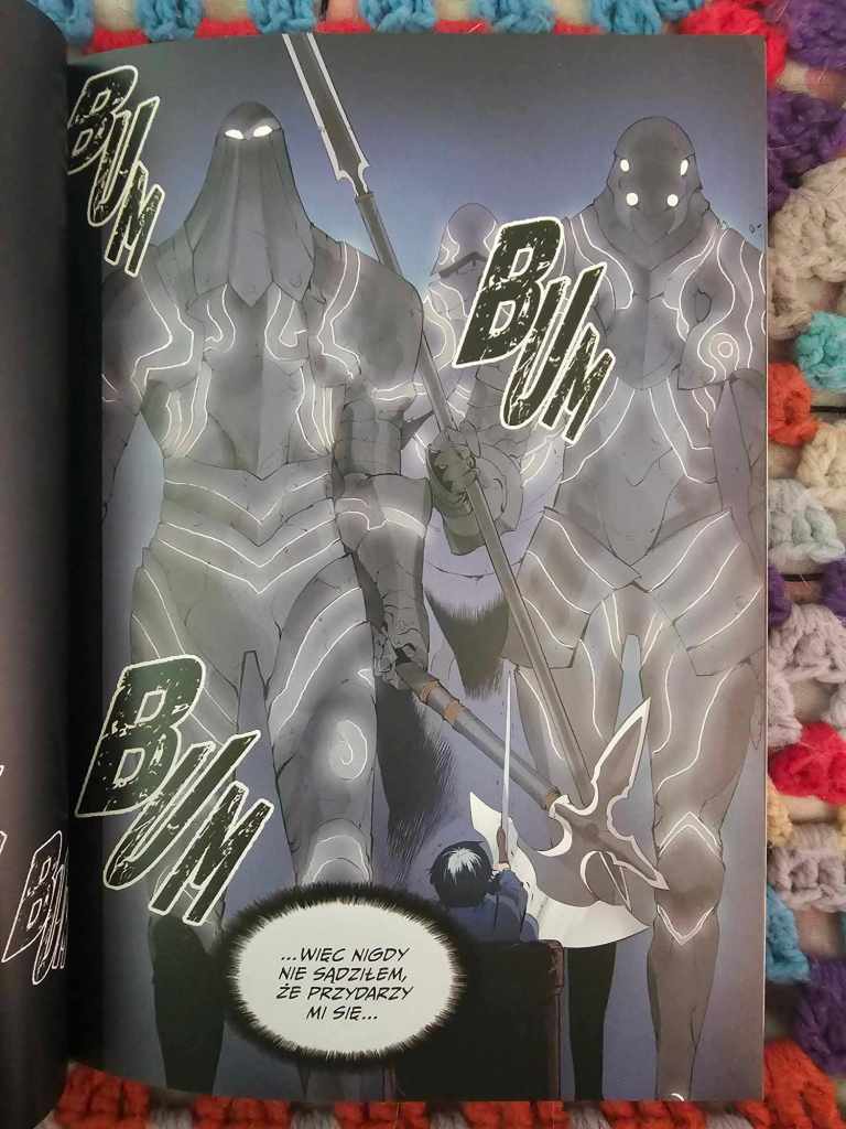 Same ilustracje są szczegółowe, a Solo Leveling to w pełni kolorowy komiks, więc mamy także okazję docenić klimat poszczególnych scen, oddany także za pomocą barw. Choć historia zaczyna się naprawdę skromnie, to z czasem doświadczamy naprawdę brutalnych i krwawych scen akcji. Po wspomnianym, spokojnym początku byłem zaskoczony tym jak nagle grupka łowców walczy o przetrwanie, a my jesteśmy świadkami utraty kończyn, wyprutych flaków oraz strachu jakiego nikt z nas nie chciałby poznać.