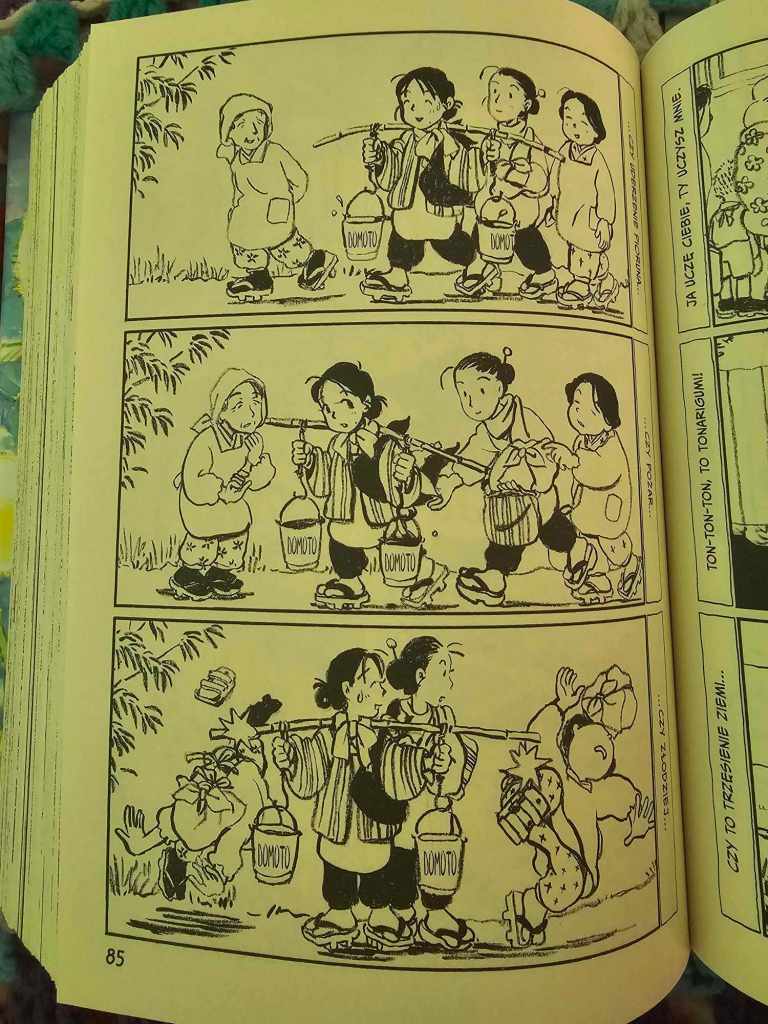 Nie chciałbym, żebyście mnie źle zrozumieli. Manga to nie tylko dramatyczne wydarzenia z czasów II wojny światowej pokazane oczami głównej bohaterki. W zakątku tego świata… ma do zaoferowania dużo ciepła i humoru. Poczynając od historii o porwaniu przez dziwnego mężczyznę, który przypomina demona i je dzieci, dzięki której poznają się przyszli małżonkowie, aż po bujanie w obłokach Suzu, co nieraz czyni z nią niezdarę i obiekt niewinnych żartów członków rodziny.