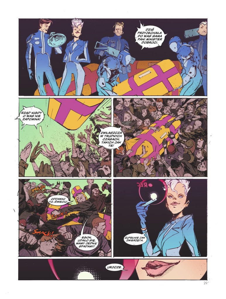 Mamy tutaj kawał mocnej, dynamicznej akcji. Ta przyniosła mi wręcz na myśl komiksy Daniela Warrena Johnsona, które podobnie jak Lucja często atakują nas swoim klimatem, barwnością i nieraz także krzykliwością. Zresztą, gdybym nie znał nazwisk autorów, spokojnie mógłbym pomyśleć, że jest to jedna z prac jakiegoś amerykańskiego autora. Zdajecie już chyba sobie zatem sprawę, że wizualnie otrzymujecie tu prawdziwą perełkę, którą nacieszycie swoje oczy.