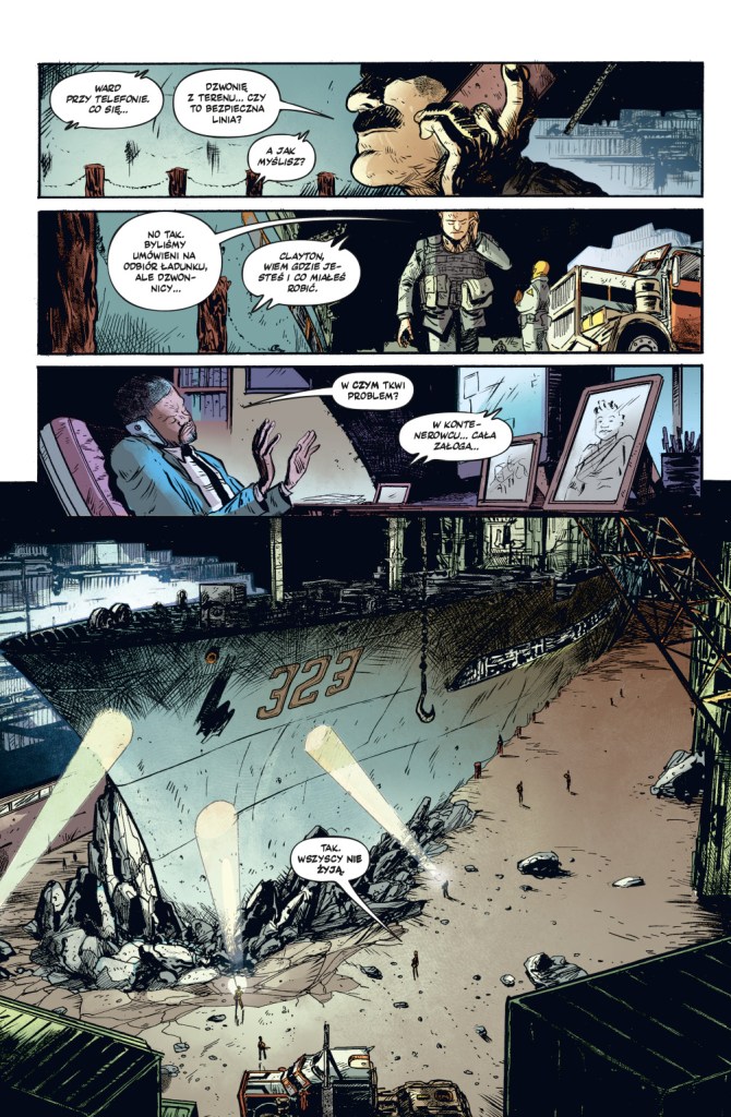 Ilustracje Johnsona dla mnie zawsze są głównym punktem każdego projektu, przy którym pracuje. Nie inaczej jest w przypadku Widmowej floty. Dynamiczny styl Amerykanina świetnie pasuje do scenariusza Catesa. Dlatego sceny akcji wypadają fantastycznie i są pełne emocji. Jest w tym stylu coś old-schoolowego, jednocześnie odpowiadającego dzisiejszym standardom, co w pełni do mnie trafia. Zarówno, gdy widzimy morze martwych ciał, czy gdy widzimy uśmieszek bohatera, podsłuchującego swojego byłego partnera.