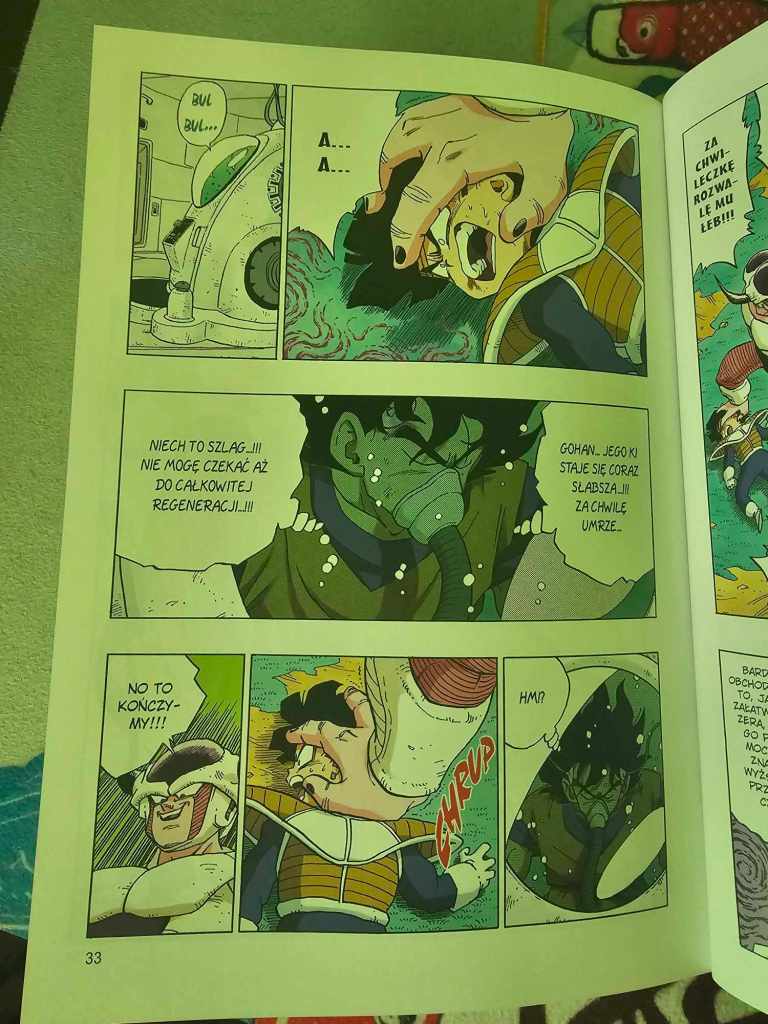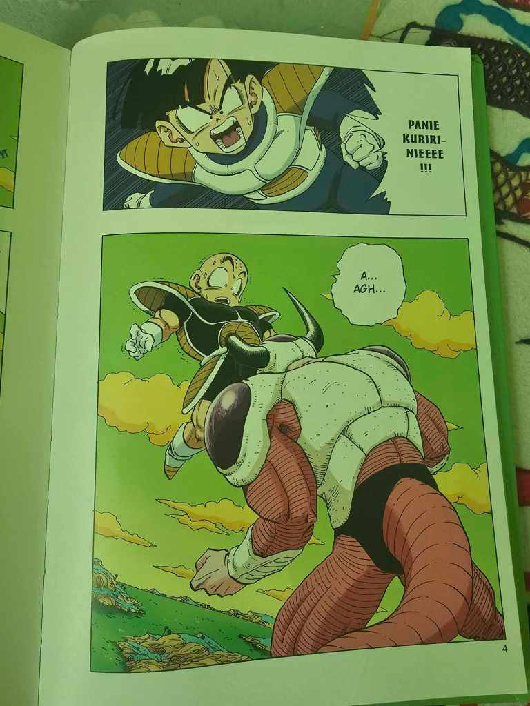 Ten fragment historii z animacji zapamiętałem jako niemal niekończącą się konfrontację z Frizerem. Anime do granic możliwości rozciągnęło ten wątek. Tutaj jednak fabuła posuwa się do przodu w barwny i dynamiczny sposób. Jeszcze w tym tomie, po kilku zaskakujących zwrotach akcji (powrót wzmocnionego Piccolo, Kuririn niemal zabijający Vegetę, Dende uzdrawiający bohaterów) do akcji wchodzi Goku. Czwarty tom Dragon Ball Full Color: Saga o Frizerze to jednak jedynie przedsmak ich starcia.