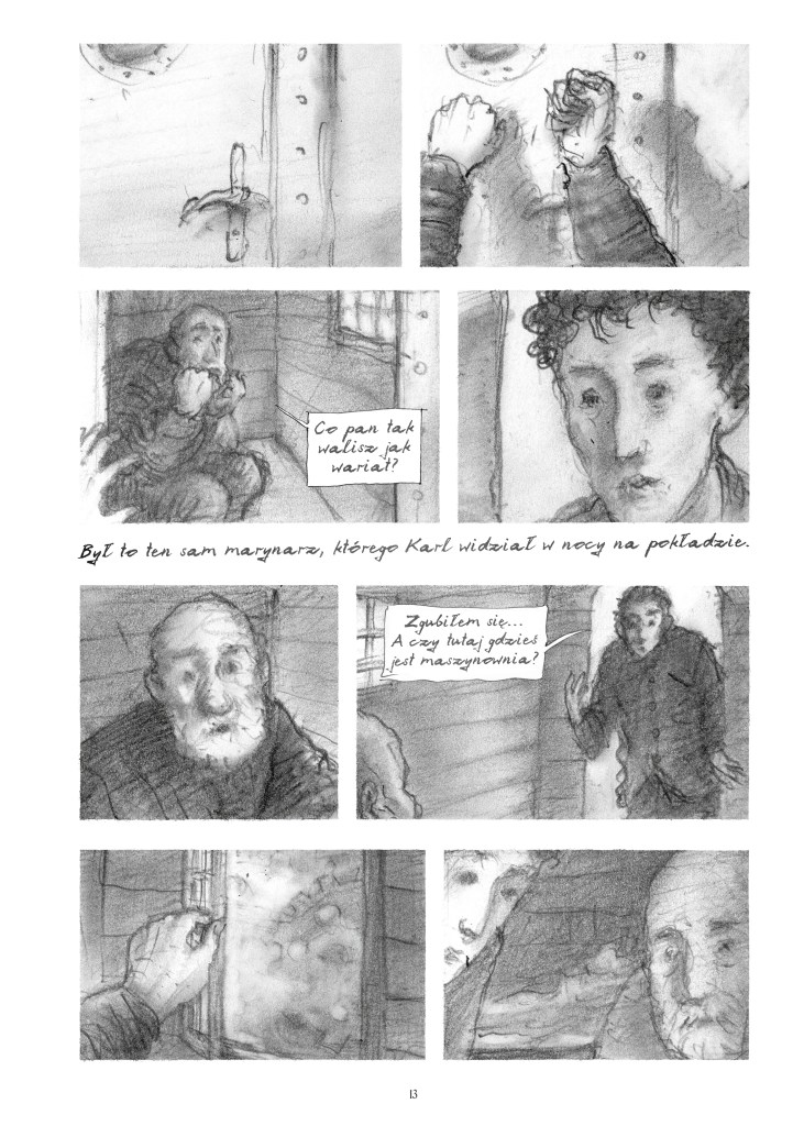 Co mogę więcej powiedzieć o komiksie? Ameryka to historia, która równie szybko mnie zaintrygowała co wciągnęła. Czytając kolejne strony byłem ciekaw jakie będą kolejne ruchy Karla. Czy znów zrobi coś, co wpędzi go w tarapaty, czy może jednak uśmiechnie się do niego szczęście? Wszędzie wszechobecne są emocje, a w powietrzu czuć napięcie, a nawet seksualne pożądanie i to w naprawdę zaskakujących momentach. Tytuł ten będzie miał dla was wiele niespodzianek, ale wydaje mi się, że dla każdego może nabrać osobistego znaczenia.