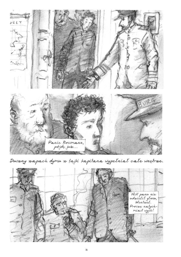 Tej sennej wizji Kafki odpowiadają ilustracje. Niedopowiedziane, zostawiające wiele naszej wyobraźni. Nic nie jest tutaj szczegółowe, czy dopracowane do najmniejszych detali. Sami musimy domalować sobie nieraz tło wydarzeń. Poza tym, rysunki zdają się idealnie oddawać senny klimat tej opowieści. Klimat pełen napięcia, nieraz sugerujący nam jakbyśmy poruszali się po cienkiej granicy między dobrem, a złem. W wielu momentach chcemy wręcz odwrócić wzrok, nie ze względu na styl ilustracji, lecz zdarzenia, które doskonale obrazuje.