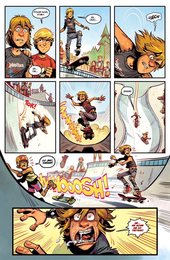 Strasznie spodobała mi się barwna, ciepła i dynamiczna oprawa wizualna komiksu. Pozwala nam bardzo łatwo wczuć się w historię i poczuć się częścią lat 80. Od ciuchów, przez auta, aż po ulice, domy i wszystkie dzieciaki, szybko wsiąkamy w tę rzeczywistość. W tej historii odnajdujemy zaskakująco dużo akcji i nie mam na myśli tylko trików na deskorolce. Są sceny, w których bohaterowie nieźle się tłuką i jest to nie tylko zaskakujące, ale także wygląda po prostu świetnie i te fragmenty zostały idealnie zaakcentowane przez twórców.