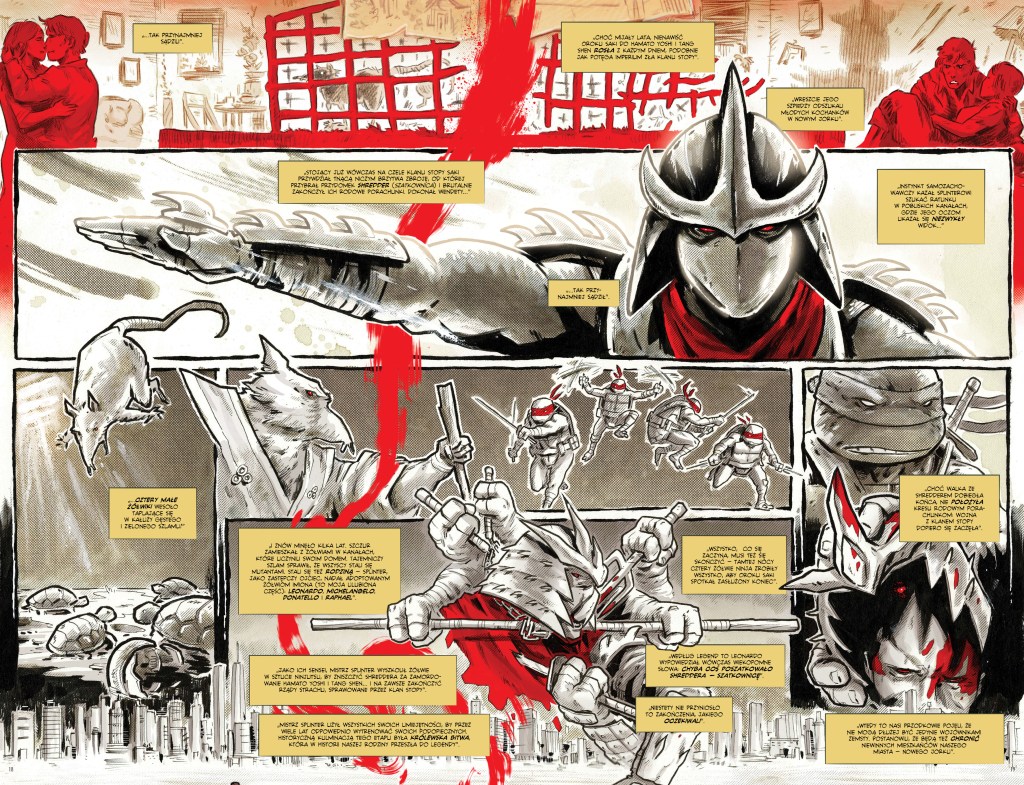 Nie inaczej jest w przypadku oprawy wizualnej. Wojownicze Żółwie Ninja: Ostatni Ronin II: Re-Ewolucja to idealnie wyważona, mroczna historia. Żółwie wnoszą mnóstwo kolorytu do tego mroku i są światłem całej historii. Ilustracje świetnie łączą futurystyczne elementy ze światem tradycji, które starają się kultywować opiekunki głównych bohaterów. Nie mogę też nie pochwalić scen akcji. Choć odniosłem wrażenie, że ten tom był trochę przegadany i było w nim za dużo czytelnej ekspozycji, to same walki stanęły w moich oczach na wysokości zadania.