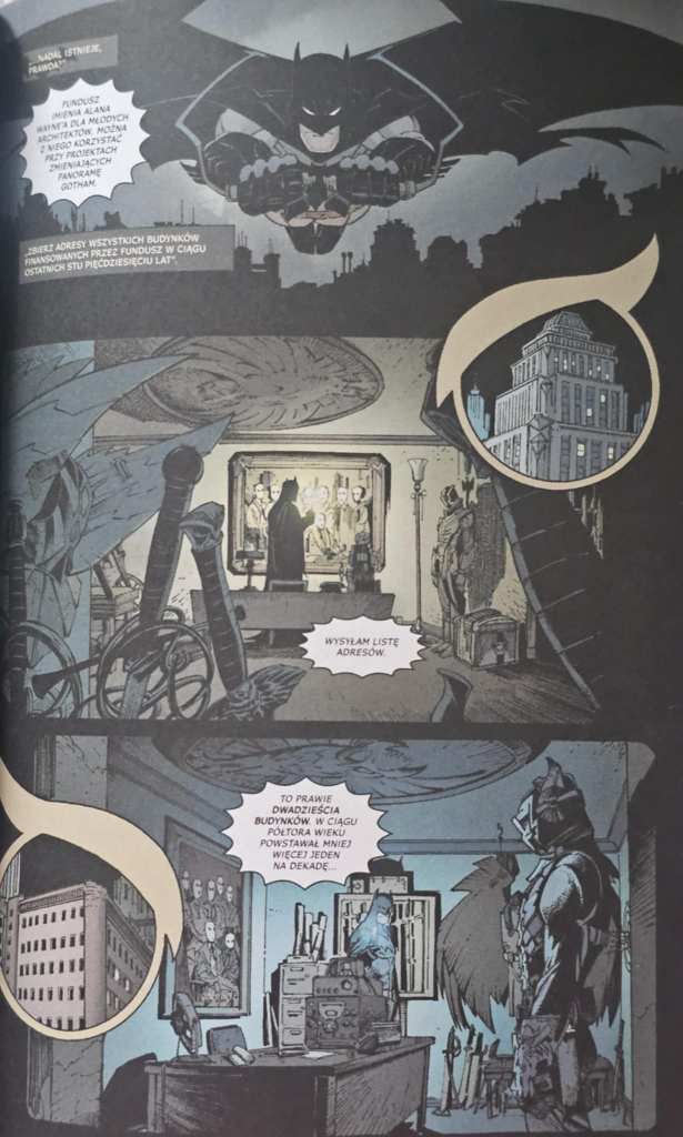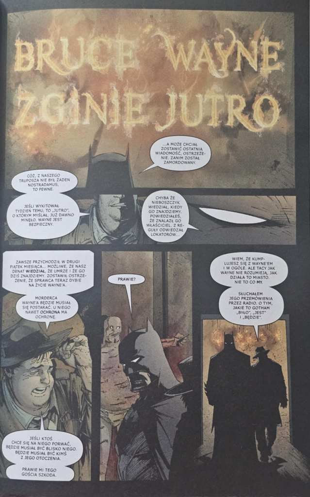 Narracja jest czytelna, nawet gdybyśmy nie mieli do czynienia ze zbyt wieloma komiksami z tego uniwersum. Nie czułem się zagubiony ani przytłoczony nawiązaniami do innych wydarzeń czy postaci, choć pojawia się tu kilku „pomagierów” Batmana. Komiks prowadzi czytelnika sprawnie, a tempo jest dobrze wyważone — są momenty akcji, ale sporo miejsca poświęca się też budowaniu atmosfery niepokoju i paranoi. Im bardziej zagłębiamy się w historię, tym bardziej czuć, że Batman traci grunt pod nogami, co wypada bardzo przekonująco.