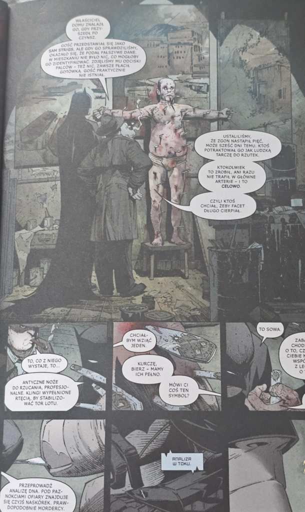 Już sam pomysł fabularny był dla mnie miłym zaskoczeniem. Nie jest to typowa historia, w której tytułowy bohater mierzy się z siejącym chaos złoczyńcą. Tym razem sprawa jest zdecydowanie bardziej osobista. Pojawia się tutaj tajemniczy, owiany legendą Trybunał Sów, w który nawet Batman nie wierzy. Jednakże, do czasu. Wkrótce przekona się, że jest on bowiem bardzo prawdziwy, a na dodatek związany z jego osibą.