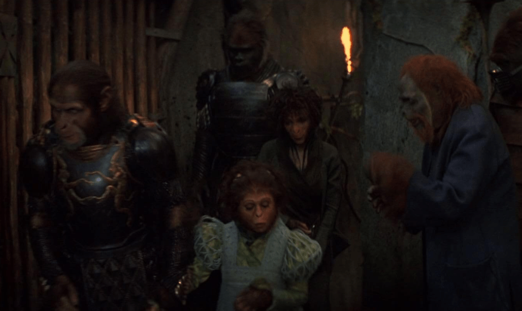 To, co rzuca nam się w od razu w oczy, to większe postawienie na akcję i w zasadzie odrzucenie filozoficznej głębi oryginału. Burton bardzo szybko zaznacza panującą na planecie hierarchię, a także ideologię głównego bohatera i małp. Ludzie dobrzy, małpy złe, choć kilka z nich mu pomaga. Scenariusz sprawia wrażenie niedopracowanego, a przynajmniej jakby wycięto z niego kilka istotnych scen. Historia jest banalna, a plany Davidsona zbyt łatwo udaje się zrealizować, mimo hord nieprzyjaznych małp wokół.