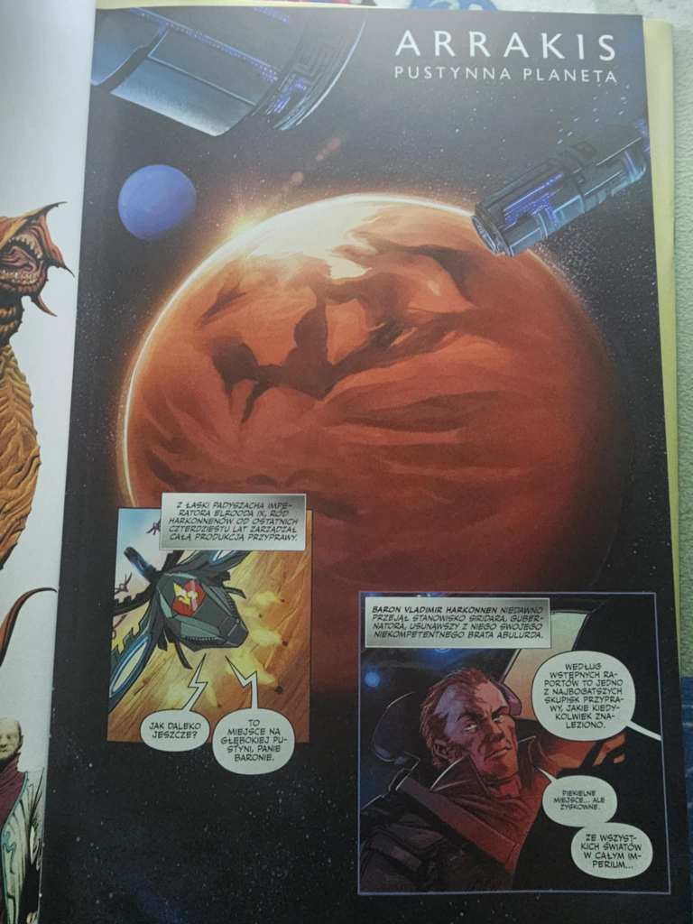 Jeśli chodzi o styl graficzny, to kolejne lokalizacje są barwne i charakterystyczne, ale jednocześnie czegoś im brakuje. Momentami miałem wrażenie jakbym czytał jeden z wielu komiksów Star Wars, które się ze sobą zlewają. Rysunki są solidne, ale nie wywołują efektu „WOW”. Z kolei kolorystyka, podobnie jak cały ton komiksu, dobrze pasuje do świata Diuny wykreowanego zarówno w książkach jak i w filmach i serialu HBO. Kolejny dowód na to, że czytelnicy zaznajomieni z tym uniwersum będą mieli więcej frajdy niż nowi odbiorcy.
