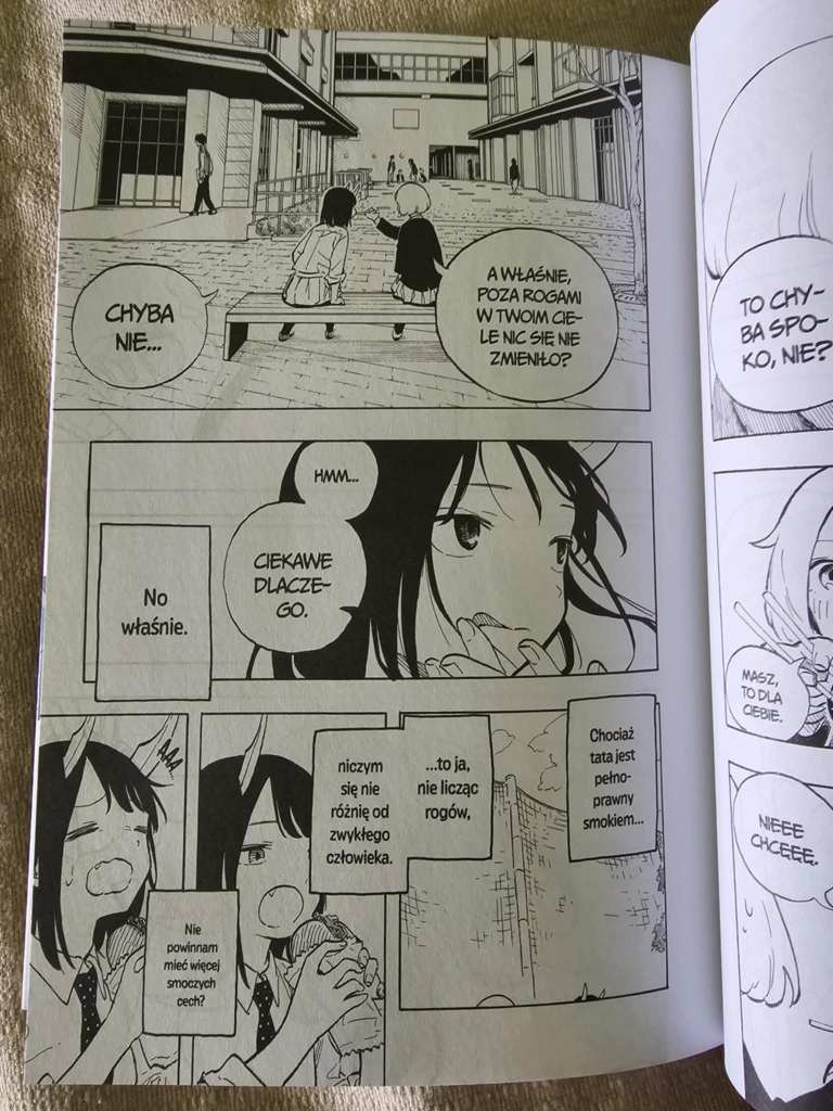 Pierwszy tom to raptem sześć rozdziałów, stanowiących wprowadzenie do zupełnie innego niż dotychczas życia bohaterki. Całość jest utrzymana w klimacie slice-of-life z elementami fantasy. To historia o dojrzewaniu z zaskakującym zwrotem akcji już na pierwszych stronach. Znajdziecie tu dużo humoru sytuacyjnego (przypadkowe zianie ogniem w trakcie lekcji), niezręczności okresu dojrzewania (wszyscy chcą pomacać rogi Ruri), interakcji z klasą i akceptowania nowego stanu rzeczy przez bohaterkę. Nie ma tu kojarzonych z fantasy epickich walk, czy ratowania świata. Jest za to licealne życie z dodatkiem smoczych komplikacji.