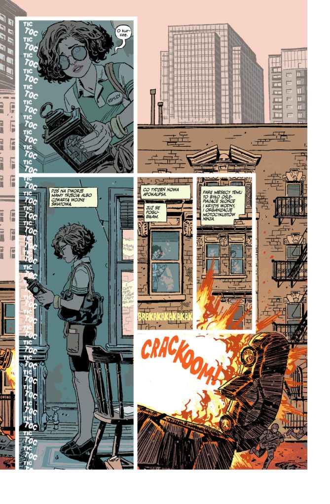Eric Zawadzki i kolorystka Jordie Bellaire wykonują tutaj niesamowitą robotę, wizualizując różne zakłócenia czasu za pomocą różnorodnych układów plansz i odważnego użycia barw. Pod względem ilustracji w pamięć zapada zwłaszcza ostatni rozdział. Pokazuje on kobietę uwięzioną w pętli czasowej, która próbuje żyć swoim trudnym życiem. Wiele stron ma okrągłe kadry, więc dosłownie musisz obracać komiks, żeby przeczytać, co się dzieje. Dodatkowo, widać pewne różnice między poszczególnymi rozdziałami, a ich styl dobrze dopasowuje się do opowiadanych w nich historii.